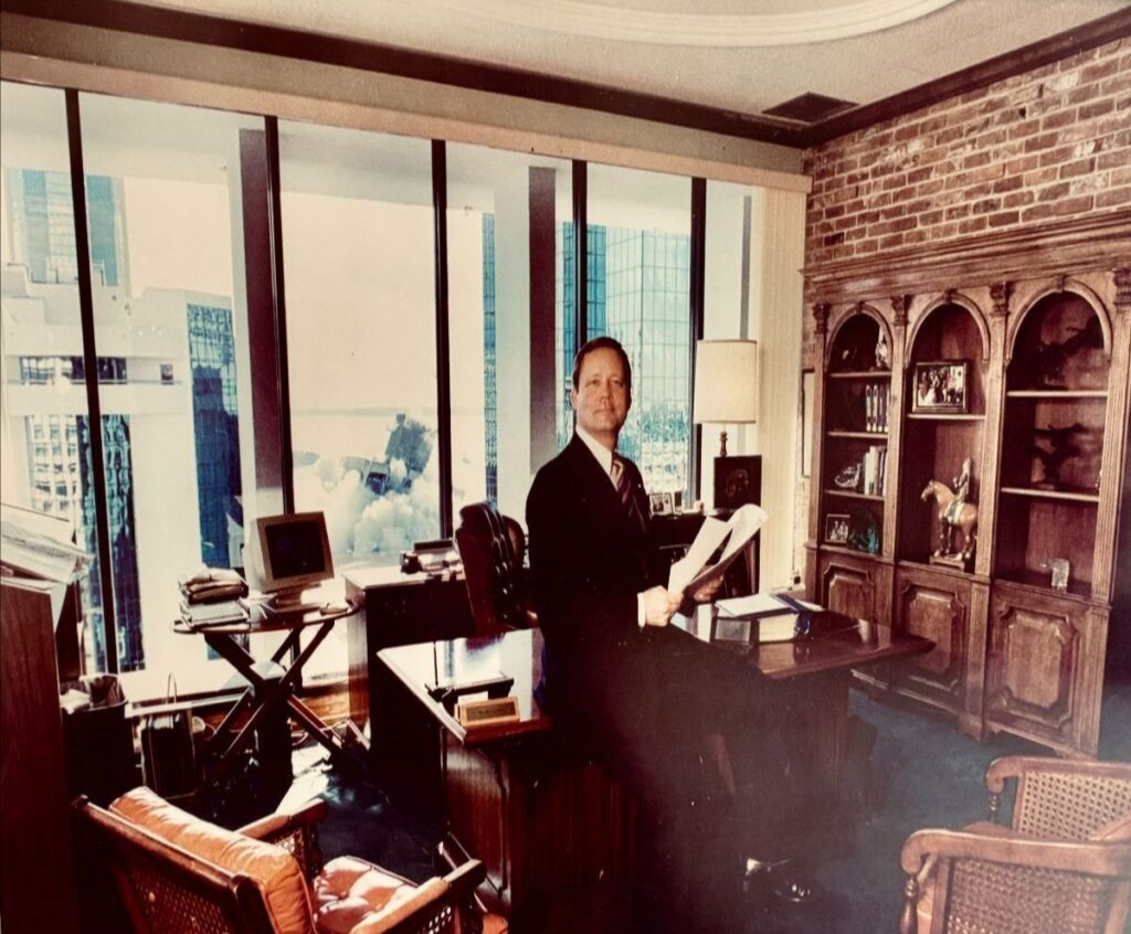 - One shows my father sitting at his desk in a brand-new building on Brickell Avenue, and in the background, a new corporate HQ building he was developing on Biscayne Bay, in 1970.
